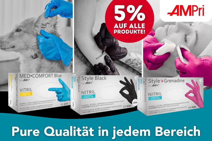 Guanti in nitrile e vinile sono due di queste opzioni, che non solo convincono per la loro compatibilità cutanea, ma offrono anche un'efficace protezione equivalente. I guanti in nitrile si distinguono per la loro elevata resistenza a diverse sostanze chimiche e oli, il che li rende una scelta ideale per i professionisti medici e per l'uso nell'industria alimentare. Offrono non solo una protezione efficace contro la contaminazione, ma anche un alto livello di comfort. La scelta di guanti in nitrile o guanti in vinile è quindi non solo una questione di compatibilità con la salute e la pelle, ma anche una decisione consapevole per la sicurezza e la protezione nell'applicazione specifica. Con queste alternative ipoallergeniche, potete garantire che proteggete sia la vostra salute che quella dei vostri pazienti o clienti in modo ottimale.