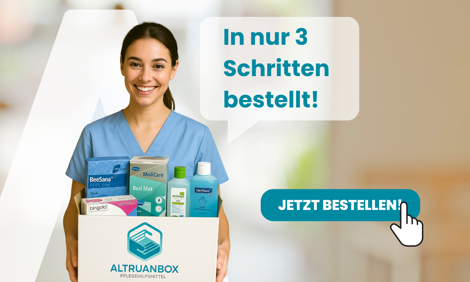 Schnell & EinfachPflegehilfsmittel individuell zusammenstellen, Online-Antrag ausfüllen und unterschreiben. Monatlicher Versand zum gewünschten Termin.
