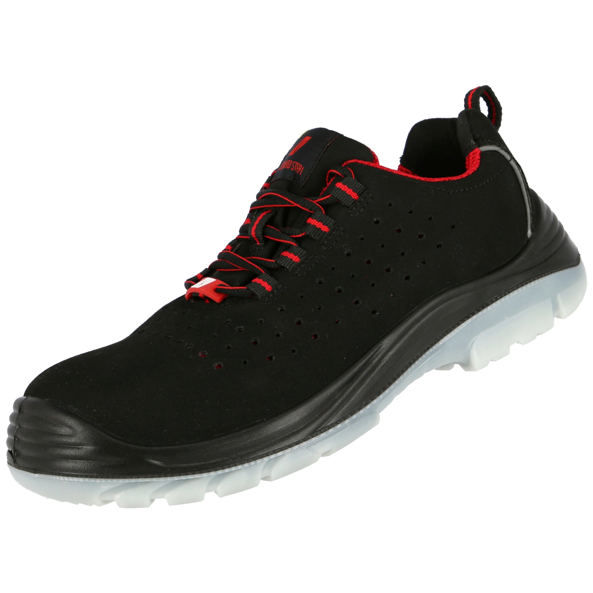 NITRAS MICRO STEP, scarpe basse di sicurezza, S1 P, microfibra resistente, nero (codice colore: 1000), suola resistente in PU / TPU, nero / trasparente, puntale in fibra di vetro, intersuola in tessuto resistente alla perforazione, senza metallo, soletta COMFORT STEP di alta qualità, forma ergonomica, design accattivante, migliore resistenza allo scivolamento possibile (SRC), larghezza 11, strisce riflettenti sul tallone, fodera del tallone per un facile inserimento e rimozione e rinforzo del tallone in robusta microfibra, Testato DGUV regola 112-191, tipo 1, tipo 2, compatibile con ESD, categoria di rischio DPI II