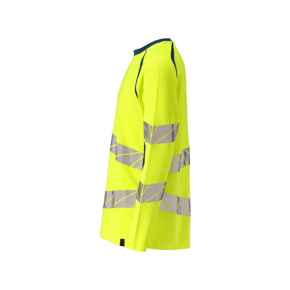 Ein hochmodernes, fluoreszierendes Langarm-T-Shirt mit schräg verlaufenden Reflexen für optimale Sichtbarkeit und Komfort.